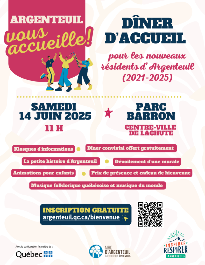 Pour plus d’informations sur le dîner d’accueil ou pour s’y inscrire, veuillez visiter le www.argenteuil.qc.ca/bienvenue. Les inscriptions sont requises avant le 6 juin 2025. L’événement aura lieu beau temps, mauvais temps.